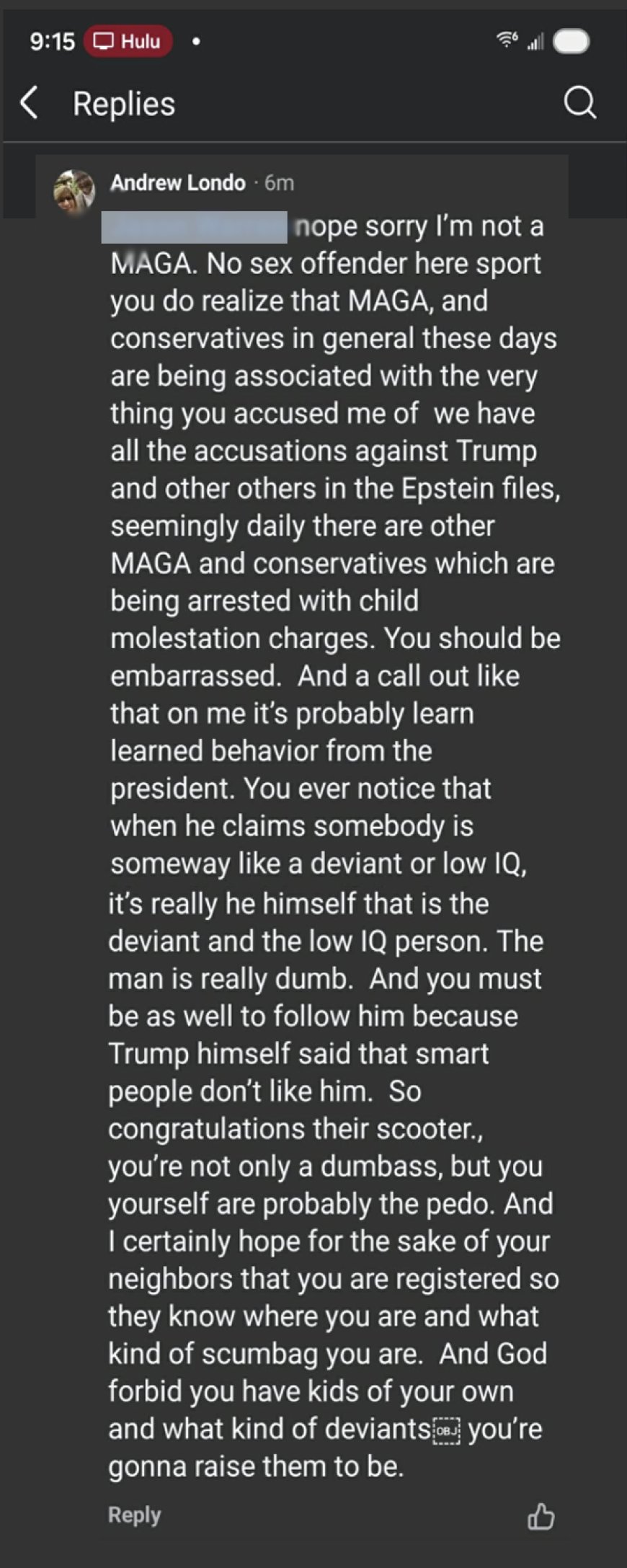 In additon, it is troubling to think that students are being taught by someone who may not have their best interests at heart. Londo's apparent disdain for the students he is supposed to be educating is evident in his attitude and behavior towards them. It is difficult to imagine how someone who harbors such negative feelings towards more than 1/2 of the country could possibly inspire and motivate anyone to learn.